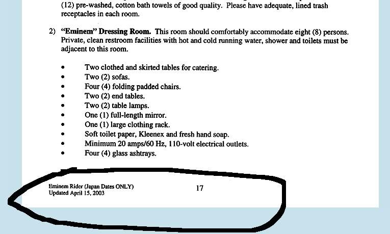 Why do they demand those things? Well, because they can. So with the "Home and Home" shows upon us, we decided to highlight some of the more esoteric requests from Em and Jay's previous tour riders, with a little help from folks over at the Smoking Gun. Have a glance, and pray that Comerica or Yankee Stadium don't cut corners when it comes to the grape jelly or the toilet paper.